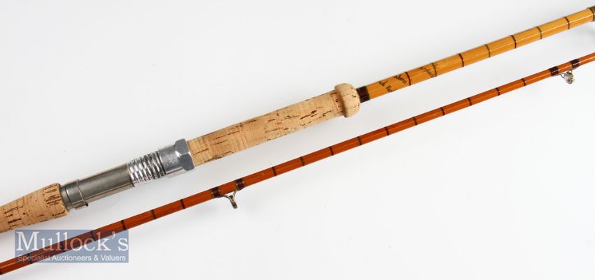 Hardy Bros Alnwick “The No.3 L.R.H Spinning” palakona rod – 9ft 6in 2pc with clear agate lined guides from the butt ring upwards – alloy tip ring broken - 29 inch mushroom style cork handle fitted with Hardy Bros alloy screw locking reel fitting together with an additional Hardy Bros sliding and reel locking fittings to the base-serial number E76494 c/w alloy ferrule protector – very clean handle and all original and comes in MCB