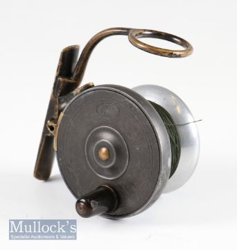 Rare smallest size P.D Malloch Perth Pat alloy side casting reel – 2 1/8” dia spool, quick release reversible drum spool, plate wind stamped with makers patent bordered oval logo, with sliding locking button – sliding cross hatched rim check button