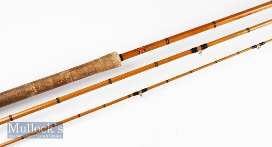Martin James British Made split cane salmon fly rod -12ft 9in 3pc - fitted with red Agate lined butt and tip guides retaining most of the makers decal transfer labels, to sliding reel ring fittings - handle soiled and comes in MCB hence the with that overall (G)