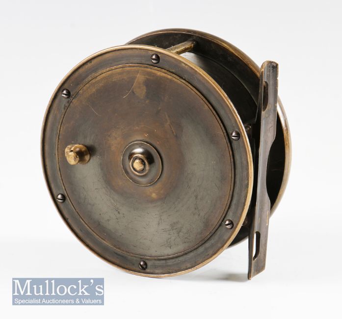 Hardy Bros Alnwick Birmingham brass plate wind salmon fly reel – 4.5” dia – with unbordered makers oval logo – perforated waist shaped foot- horn handle – fitted with an unusual on/off check button – retaining most of the original lacquered finish – good check and runs well