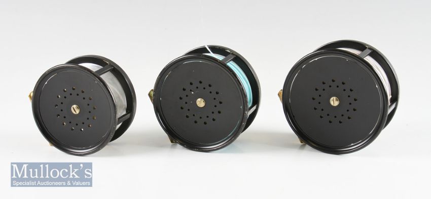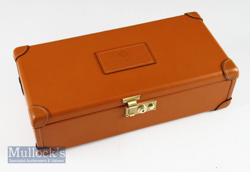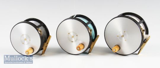 Fine Commemorative Set of Hardy 1912 Alloy Perfect Salmon Fly Reels in leather presentation case – comprising 3.75”, 4” and 4.25” – each fitted with 2 3/8” long smooth brass foot together with a spare set of 3x 3.75” smooth brass feet – 2x with Carron Fly lines incl 85ft header - in custom fitted leather reel case with oval descriptions to each section – has the original key in leather attachment together with Hardy’s green cloth reel case cover