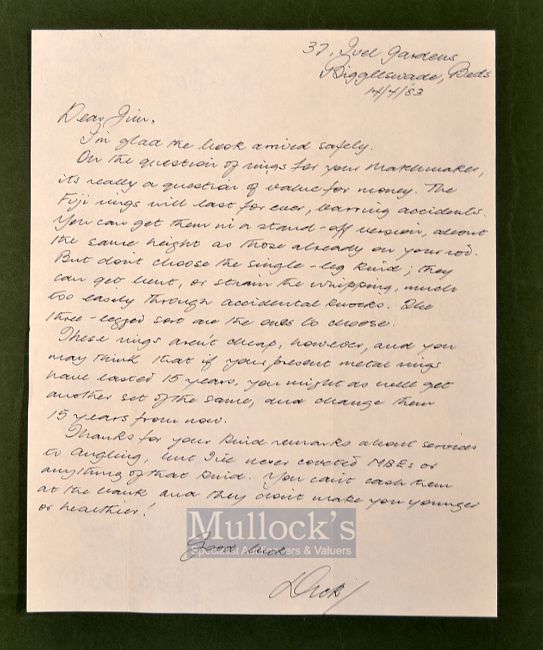 Richard Walker Letter 1983 – 14th April hand written and signed Dick – 3x paragraphs discussing the pro and cons of “rings” with regards to Cloverley’s Matchmaker rod – comparing the quality and price of Fuji rings – single leg and three leg or staying with the original metal rings which had lasted 15years – and finally his services to Angling – having never coveted MBE’s or anything of that kind “You can’t cash them at the bank and they don’t make you younger or healthier!” signed good luck Dick