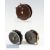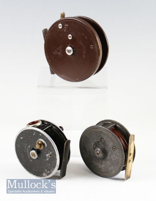 3 various Allcock alloy fly reels: 3.5” Aerial Style finished in dark brown, quick drum release button, brass rim check lever - retaining most of the original finish spins freely; 3” dia with red Agate line guide, quick drum release, smooth brass foot, brass check button turns freely; and 3” dia with a single row of perforations to the faceplate, quick drum release, constant check, smooth brass foot-retaining original silk line - loss of paint, turns freely. (The Late John Snelson Collection)