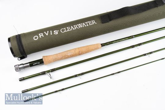 Fine Orvis Clearwater Travel Fly Rod – 9ft 4sec – line 6# wt 3 5/8oz – fitted with Orvis carbon reel seat and anodised lacquered winch fittings very lightly soiled cigar shaped cork handle-in very good condition together with makers cordura rod tube.