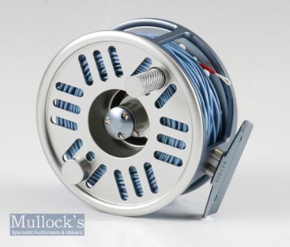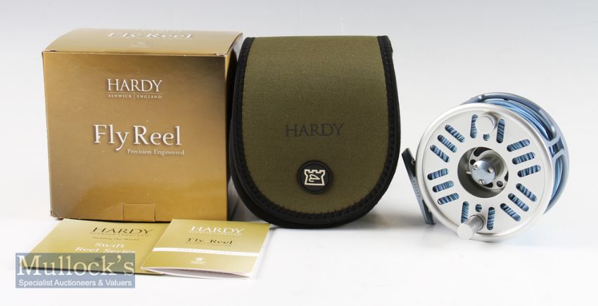 Fine Hardy Swift 1025 hi tech salmon fly reel – 4” dia large arbor, back plate disc drag – stamped A29022 to the foot – left and right hand wind – anodised blue/silver finish c/w Carron fly line appears unused in makers green neoprene reel case