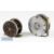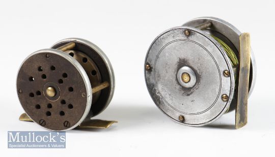 2x interesting Heatons small brass, ebonite and alloy combination fly reels – Jardine Pat 1881 brass and ebonite 2”dia with nickel silver rims, brass foot with knocks to both ends, wobbly face plate; and another stampeded “Au Percheur Breton Paris -Importe Angleterre” 2.5”dia with alloy back plate, nickel silver rim (small ½” crack), smooth brass foot with slight knocks to both ends, constant check – turns freely.