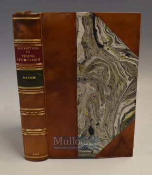 Hawker Peter Instructions to Young Sportsmen in All that relates to Guns and Shooting – Longman, Rees, Orme, Brown, Green, and Longman, London, 1826. Fifth edition, corrected and improved; with explanatory plates and woodcuts. Illustrated with plates and wood-cuts. Old style Three quarter brown leather and marble boards, gilt spine title and author on red and green leather