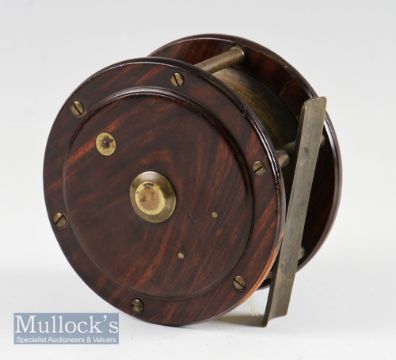 Scottish pattern rosewood/brass salmon fly reel c.1880 - 4” dia wide drum, brass winding plate, polished rosewood handle, brass pillars and foot, runs smoothly – good check – 2x small hair line cracks to front rim – very presentable reel . (The Late John Snelson Collection)
