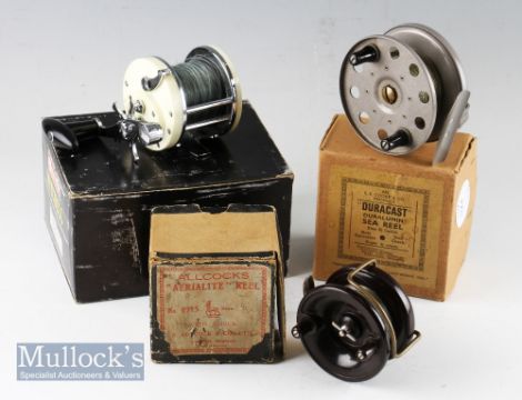 Collection of various sea and other reels (3): Garcia Mitchell 602P salt water reel in the original makers box with oil tube, spanner and parts list-only used once (VG); S.E Cooke & Co Product Duracast Duralumin Sea Reel – 3.5’ dia c/w line - in makers box with the original makers sales leaflet would appear unused; and fine Allcock’s “Aerialite” 3”wide drum casting reel with brass bickerdyke line guide original makers labels and in the original box retaining the makers label to the lid - one side split .