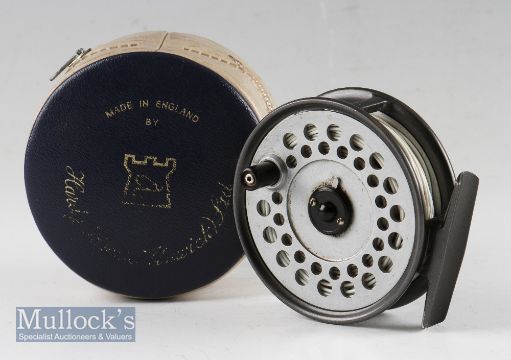 Hardy Viscount 130 alloy trout fly reel – 3.25” dia, lacquered smooth alloy foot, reversible U shaped line guide, constant check c/w line (Jet Dry Fly DT-5) – constant check – regtaining nearly all of the original finish c/w Hardy padded case
