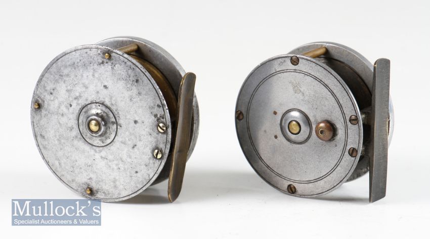 2x Scottish alloy and brass combination fly reels – D Crockhart & Co Stirling 3” dia with brass plate wind, drum core and foot slightly filed at both ends; and J.S Sharpe Aberdeen 2.75 inch diameter with similar brass plate wind, drum core and foot - both with constant checks and turn freely. (The Late John Snelson Collection)