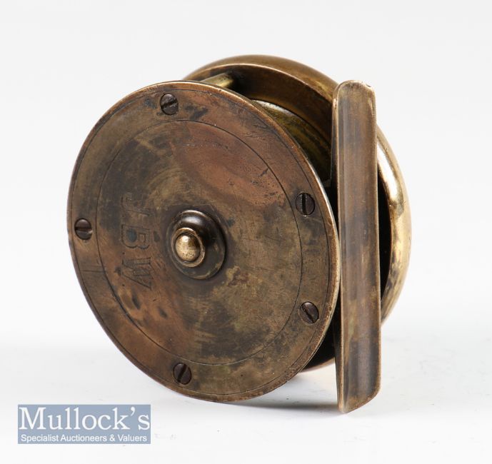 Scarce small P.D Malloch Perth Patent Sun and Planet brass multiplying reel – 2.5” dia stamped with the makers bordered oval Malik’s Patented logo together with the owners initials engraved to the back plate J.B.W - runs very smoothly and retaining some of the original lacquered finish to the faceplate very rare size (The Late John Snelson Collection)