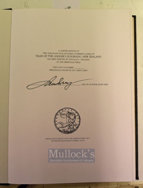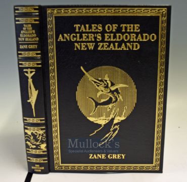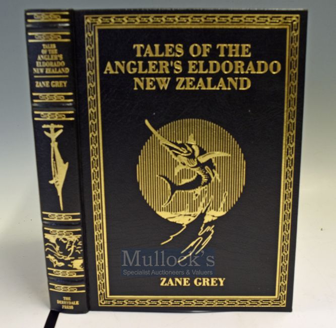 Grey Zane Tales of the Angler’s Eldorado New Zealand – Derrydale Press Inc Publishers Lyon Mississippi 1926 reprint 1953 Black cloth with gilt title and illustration to front board and spine, black monochrome photograph endpapers.