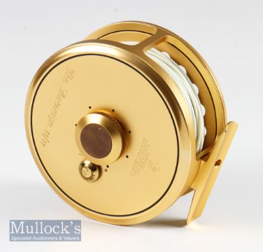 Fine Hardy The Sovereign 11/12 Salmon fly reel – 4” dia gold finish, wooden handle smooth foot, backplate disc drag adjuster, fitted with Carron 85F fly line - maker’s faux sheep skin lined case – overall (VG).