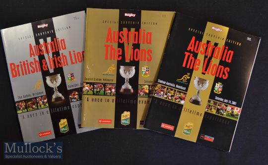 2001 British & Irish Lions in Australia Test Rugby Programmes (3): All three large glossy test issues from Brisbane^ Melbourne & Sydney for this close-fought 2001 series. In excellent condition overall
