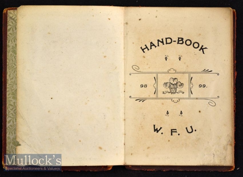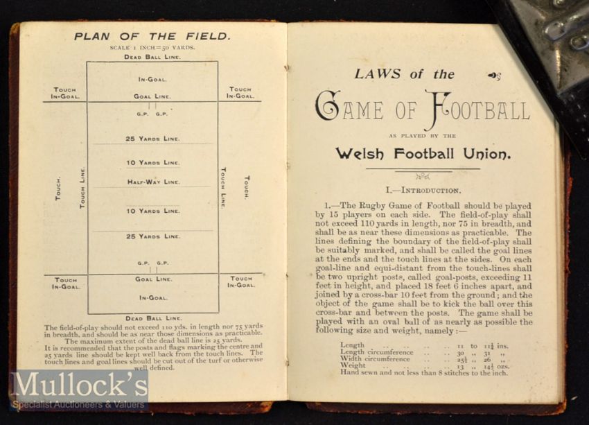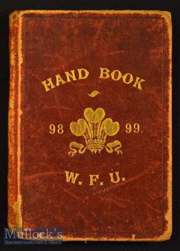 Very Rare 1898-99 Welsh Rugby Union Handbook: Well used over its 120 years^ spine loosened but holding together and with lovely ‘patina’ overall^ a red hard-bound three-feathers-embossed pocket sized issue^ with Arthur ‘Monkey’ Gould among the names and intriguing detail within. There were then just 49 official WRU ‘Clubs’ and that included a County Union^ A District Union and a College. V desirable