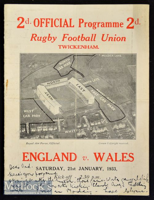 1933 England v Wales Rugby Programme: 4pp fold over Twickenham card from the historic first Wales win at ‘HQ’^ pocket fold & some wear but a famous game and added to in some ways by the inked message to cover^ ‘….Wales’ general ship won it with Bowcott’s kicking; Claude Davey’s tackling weak…’ Not the usual Davey verdict!