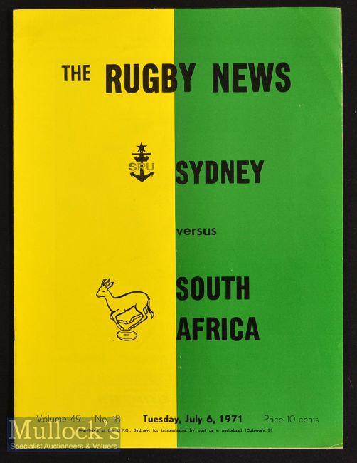 1971 Sydney v South Africa Rugby Programme: Clean sharp issue for the Sydney hosting of the Springboks^ with an appeal that fans let the authorities deal with anti-apartheid protestors and not take the law into their own hands.