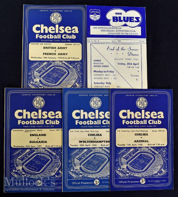 1957/58 Chelsea home programmes to include v Arsenal (Youth Cup) (single sheet)^ Wolverhampton Wanderers (Youth Cup) (single sheet)^ England v Bulgaria U23^ Kentish Cup British Army v French Army (single sheet) and 1958 The Blues Journal of Chelsea Supporters Club^ folds^ creases^ some scores^ generally good examples (5)