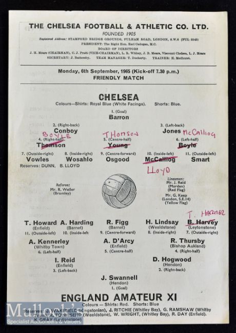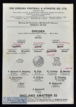 1965/66 Chelsea v England Amateur XI Friendly football programme date 6 Sept^ single sheet^ team changes^ light folds and creases o/w in good condition