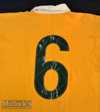 1971 Matchworn Australia Jersey & Programme v France (2): In great condition^ backrower Peter Sullivan’s gold No.6 Jersey from the tour game v France at Stade Colombes^ Paris^ November 1971; green plastic number stitched to rear^ match play stitched repair on the back of the shiort^ o/wise excellent. With near mint rare double programme^ covering that match and the one v France at Toulouse a week earlier. Splendid 50yr old pair