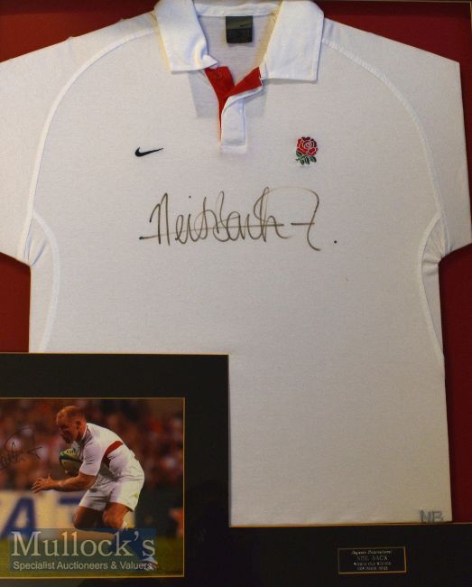 RWC 2003 Signed Neil Back Rugby Training Jersey and Photograph: Mounted^ framed and ‘glazed’ in perspex^ both clearly signed^ a Legends International product: the jersey with Nike logo and English Rose badge^ understood to be from the 2003 RWC  preparations of the famed England flanker and World Cup winner.