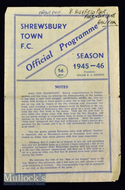 1945/46 Shrewsbury Town v Rest of the League football programme date 4 May^ midland league^ notes and team change apparent^ centre fold^ minor tears o/w a good example