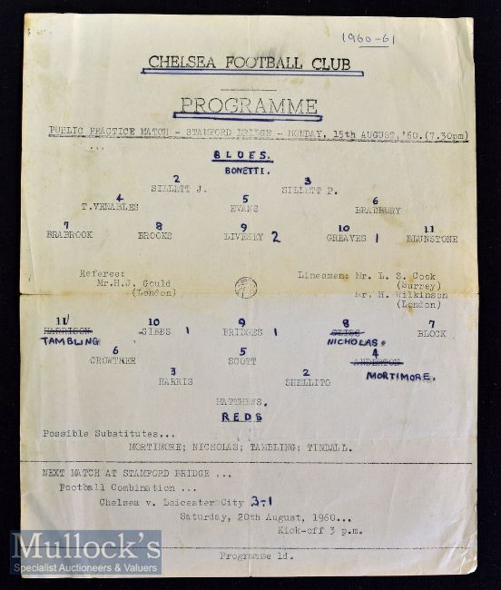 1960/61 Chelsea Public Practice Match football programme Blues v Reds date 15 Aug at Stamford Bridge^ single sheet^ with pen^ heavy folds^ slight tears^ creases etc
