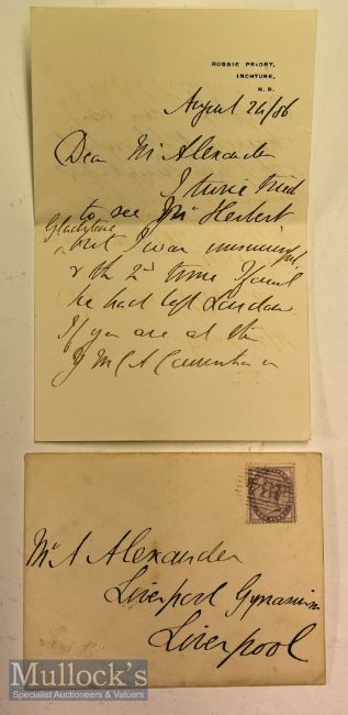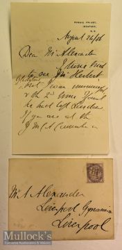 Lord Kinnaird (1847-1923) Principal of The Football Association and a leading footballer Signed Letter a three time FA Cup Winner in the Victorian era with Wanderers and Old Etonians^ throughout the course of his career played in every position^ date Aug 24^ single sheet with envelope^ in good condition