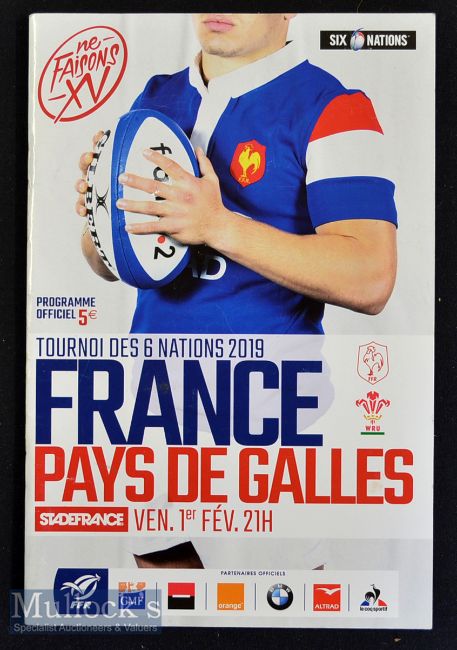 Scarce 2019 France v Wales Rugby Programme: Short print run. As France decide if they are going to do programmes or not^ and sometimes change their mind^ there have been only very small print runs recently^ often little beyond Press and VIPs and sponsor-satisfying. This from Wales’ Grand Slam season. Near mint