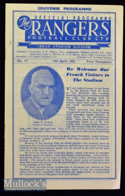 1955 Rangers v Racing Club de Paris football programme date 13 April at Ibrox Stadium^ staple removed^ minor staple bleed^ otherwise good overall