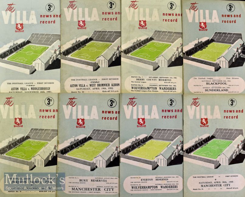 Selection of 1950s Aston Villa Home football programmes to include 55 v Manchester City^ 53 v Blackpool^ Wolverhampton Wanderers^ Manchester City^ 52 Preston North End^ Wolverhampton Wanderers^ West Bromwich Albion^ 51 Middlesbrough^ minor faults^ mostly good condition overall (8)
