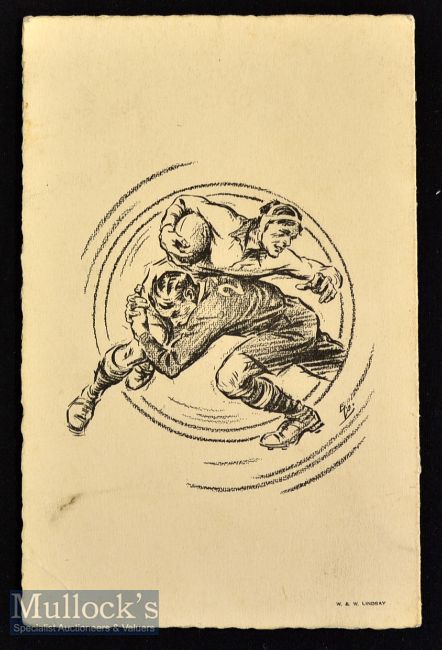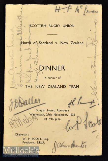 1935 Rare Signed North of Scotland v NZ Dinner Menu: Multiple signatures on 4pp card Menu with amusing Scots names for the courses at an Aberdeen hotel^ an action drawing to reverse; autographs of Scots rugby worthies including John Dallas^ Ref of Wales v NZ 1905. VG