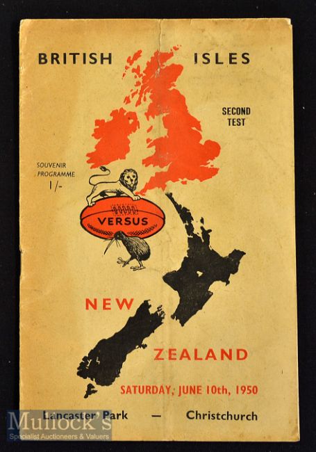 1950 British & Irish Lions in NZ Test Rugby Programme: Second Test of the popular ’50 Tour^ played at Christchurch. 20pp issue^ well yellowed and with pocket fold to attractive coloured cover. Very collectable