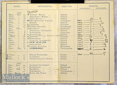 Rare 1924-5 Oxford University Rugby Fixture Card: incl the fixture against The New Zealand “Invincibles” All Blacks – neat blue fold over 4pp small card^ some wear & small nick o/wise G. Neatly filled in with results up to victorious Varsity Match