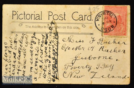 Scarce 1904 ‘British Lions’ in Australia postcard: Original b/w team photo postcard of Bedell-Sivright^ Teddy Morgan and his side Down Under^ postally used from Tasmania (with Tasmanian stamp too) to Gisborne^ NZ in 1906. 22 players in the photo. Slight wear to edges o/wise VG for 115 years old