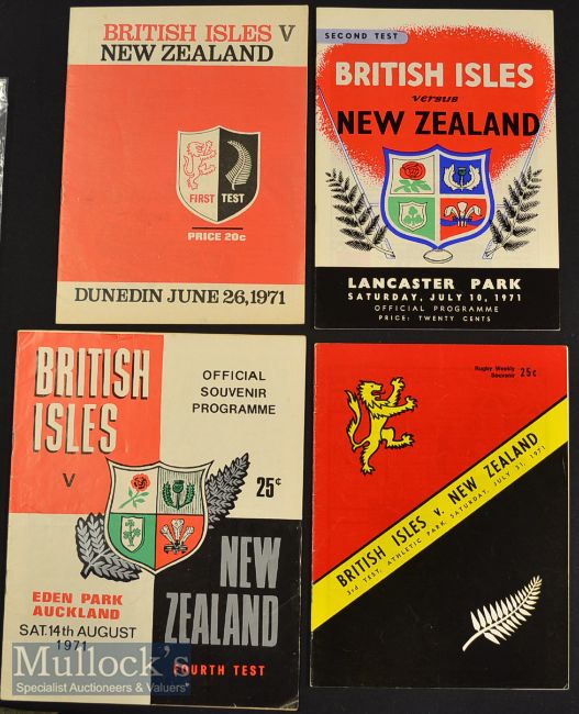 1971 British & Irish Lions in NZ Rugby Test Programmes (4): Great memorabilia from the most famously successful of Lions’ tours to the home of the All blacks. Sought-after set of all four tests^ two won^ one lost and one drawn. Most in beautiful condition^ the fourth with very minor creasing