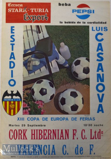 1970 Valencia v Cork Hibernian FC Football Poster colour poster^ date 29 September Inter-Cities Fairs Cup^ measures 43x2cm approx.