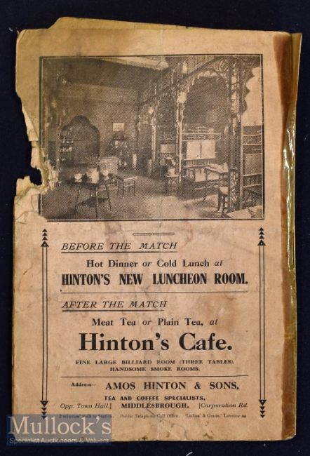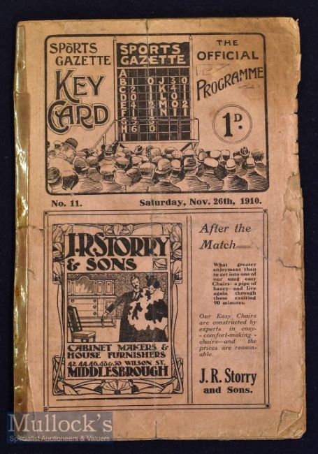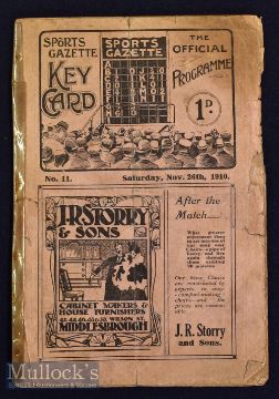 Rare 1910 Middlesbrough v Darlington football programme date 26 Nov^ with cellotape to spine^ folds^ tears apparent throughout^ F condition overall