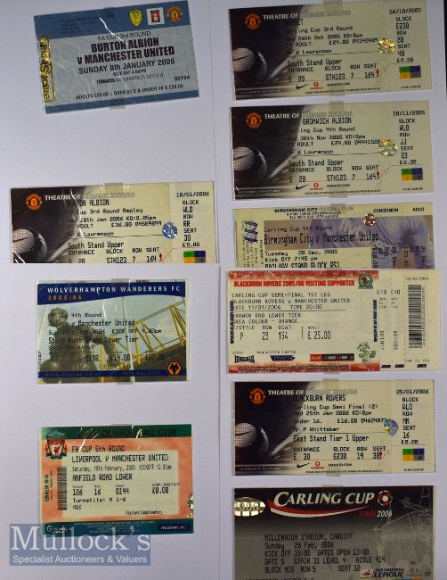 Selection of 2005/06 Manchester United football match tickets to include FAC (h) v Burton Albion^ (a) v Burton Albion^ Wolves^ Liverpool; Carling Cup (h) v Barnet^ WBA^ Blackburn Rovers (s/final)^ (9) v Birmingham City^ Blackburn Rovers (s/final)^ Wigan Athletic (Carling Cup final) and Barclays Premiership matches^ complete set of (38) and Champions League tickets homes Debrecen^ Benfica + fanzone ticket^ Lille^ Villareal^ aways v Debrecen^ Villareal^ Lille^ Benfica. Total (50+)