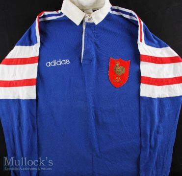 1980s or 1990s French Rugby Jersey: Large Adidas fully logoed and badged match worn jersey^ numbered 8^ in very good condition^ believed to have been worn by No.8 Jean Luc Joinel on a French tour to NZ