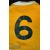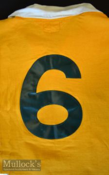 1975-6 Australian UK Tour Match worn Rugby Jersey: Lovely gold Wallaby Jersey No. 6 from that tour^ 44” chest Umbro make^ Green plastic number to reverse^ partially washed-out bloodstains to sleeve. VG