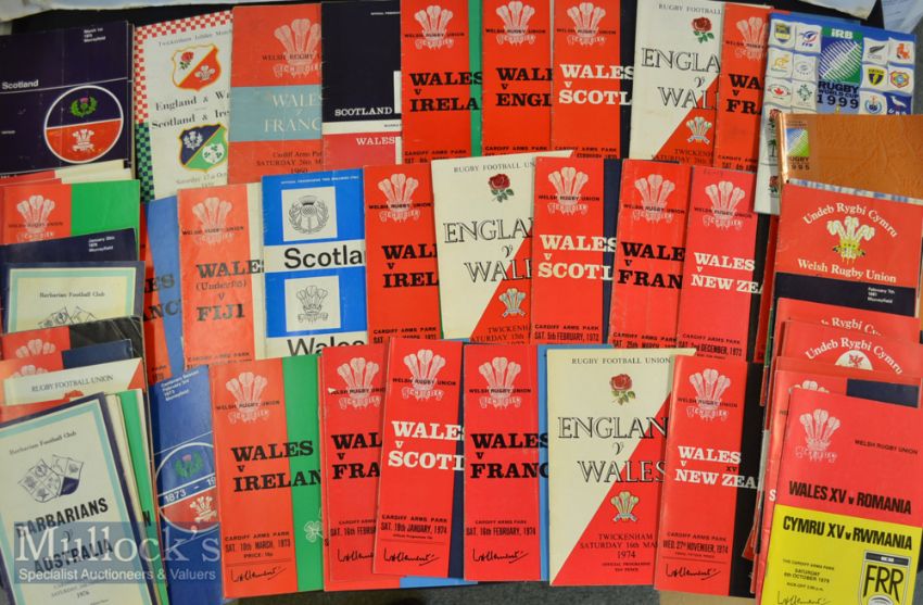 1959-1999 Bumper Rugby Programme Bundle ‘Wales plus others’ (62): What a great way to start a Welsh Programme collection! Nearly 60 Wales home and away Five Nations issues^ some at Murrayfield and Twickenham as well as Cardiff^ and tourist clashes incl Fiji^ Tonga^ Romania^ Australia and New Zealand; plus Barbarians v Australia 1976 and NZ 1978^ Four Nations games at Twickenham 1959 and Cardiff 1980^ Overseas and President’s XV WRU Centenary clashes^ France v Ireland 1990^ RWC 1995 quarter final France v Ireland and RWC 1999 England v Italy. Splendid lot^ a little duplication^ all generally G/VG