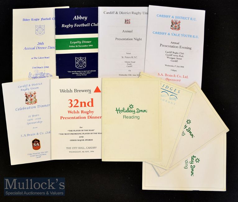 1990-2013 Rugby Dinner menus (12): Welsh Brewers’ Rugby Presentation Dinner 1994; Four Cardiff & District Rugby Union Presentation Dinners from the 2000s; & seven Abbey RFC (Reading) Awards Dinners 1990s/2000s. G/VG
