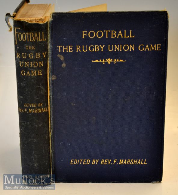 Scarce 1892 Rugby Book: 1st edition of the Rev F Marshall’s seminal work Football: The Rugby Union Game^ regarded as the pioneering literary effort on the Oval Code. Spine a little loose internally with old slim sellotaping^ and very minor loss to very top of spine^ but otherwise tight and strong with minimal foxing and brightly gilded dark blue boards^ some edge and corning bumping. A good example of this sought-after volume for its 128 years