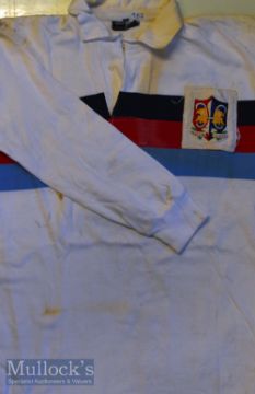 Rare 1971 Match worn Rugby Jersey^ Western Counties of Wales?v Canada: 40” white Bukta Scrum jersey in bold design of white with black^ red and blue hooped band and intricate embroidered patch Western Counties badge. Numbered 14^ which position was occupied in the game by Andy Hill of Llanelli^ prolific try-scorer and goal-kicker. Some slight darkened areas from display and match soiling but overall good.