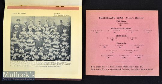 Superb Rare Queensland v NSW 1906 Rugby Programme: Really special issue with weight and intent^ c.6” v 6”^ a ‘felt’ impression to the covers^ which open vertically and are maroon with silver embossing. Details^ information^ old photographs^ and a coloured insert with the teams and pics. Unusual^ stylish and really well preserved^ spine beginning to split a little is the only ‘fault’. Very good for its nearly 115 years. A terrific opportunity