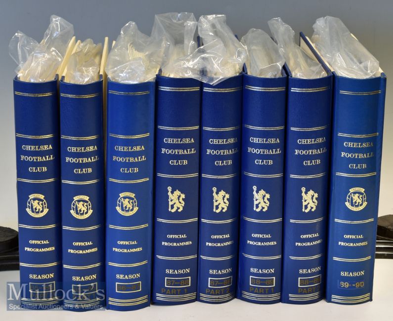 Collection of Chelsea 1985-1990 home football programmes consisting of 85/86 complete^ season ticket and club member booklets (30)^ 86/87 complete and club member and season ticket booklets (23)^ 87/88 complete plus Testimonial^ Showbiz XI^ season ticket and club member booklet (26)^ 88/89 complete and club member and season ticket booklets plus pates testimonial^ Niedzwiecki (28)^ 89/90 complete plus Kingsbury Town and club member and season ticket booklets (25) appear in very good condition overall^ in Chelsea folders (132)