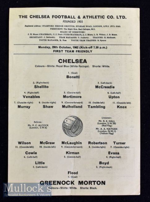 1962/63 Chelsea v Greenock Morton friendly football programme date 29 Oct at Stamford bridge^ single sheet^ centre fold^ o/w in good overall condition