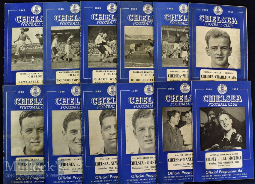1949/50 Chelsea home football programmes to include Fulham^ Stoke City^ Charlton Athletic^ Middlesbrough^ Huddersfield Town^ Bolton Wanderers^ Wolverhampton Wanderers^ Newcastle United + FAC^ Chesterfield FAC^ Manchester United FAC^ A.I.K Stockholm Inter-Club^ light staple rust and bleed to some^ light folds etc o/w in A/G condition overall (12)